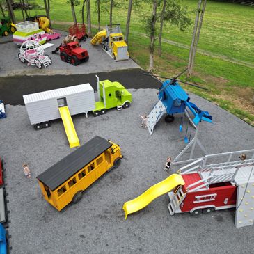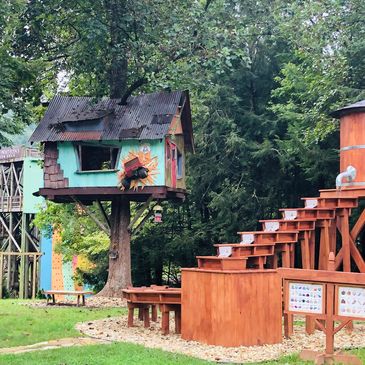 Follow the fox to our playground filled with custom amish-made playground equipment. From firetrucks to helicopters to Cinderellas carriage we've got something every child will enjoy!